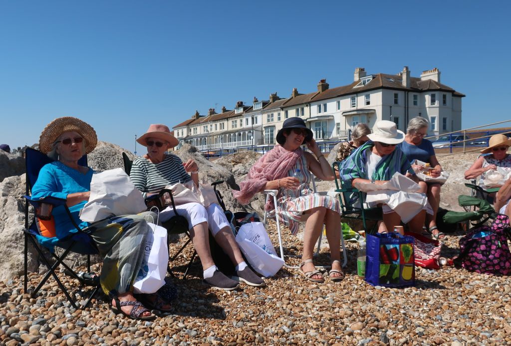 16 members enjoyed their fish and chips washed down with Prosecco or apple juice on Hythe beach on Friday 12th August. We sat out in full sun (with plenty of sun tan lotion applied) , luckily with a strong cooling breeze – such a contrast from last year’s weather! A good time was had by all. Our thanks go to Daphne and Elisa for organising the food and refreshments.